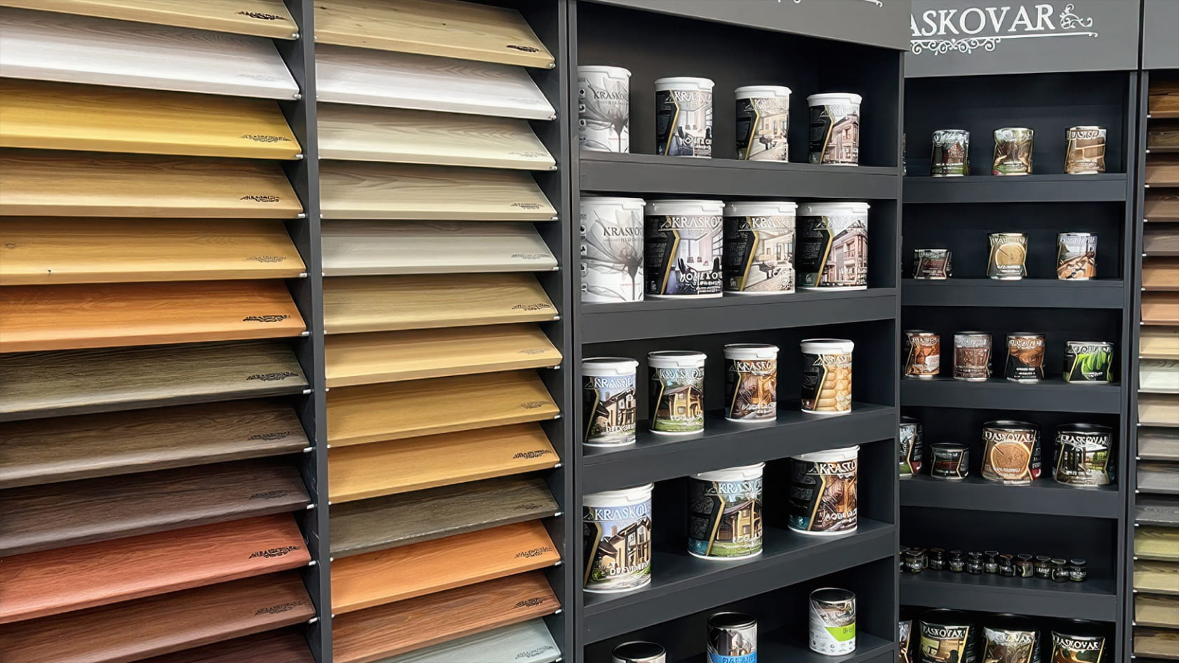 В нашей работе мы используем лакокрасочные материалы собственного производства под брендом Kraskovar.